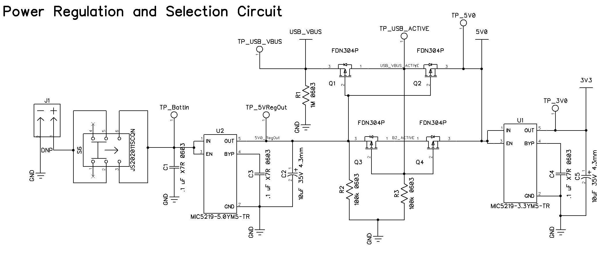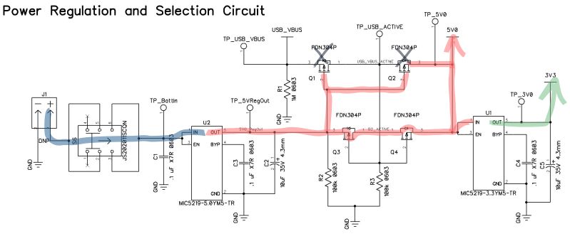With the battery attached and the switch turned on, current flows through to the 5.0V LDO and through Q3 and Q4 to the 3.3V LDO and out to the rest of the circuit. R3 keeps the gate potential of Q3 and Q4 at 0V. At the same time, the gates of Q1 and Q2 are energized, stopping reverse conduction of current through the circuit.