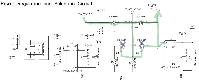 When both sources are energized, the 5.0 V LDO generates a potential difference at the gates of Q1 and Q2, shutting off the conduction path across the drain and source, stopping USB_VBUS current before it ever gets a chance to enter the rest of the circuit.