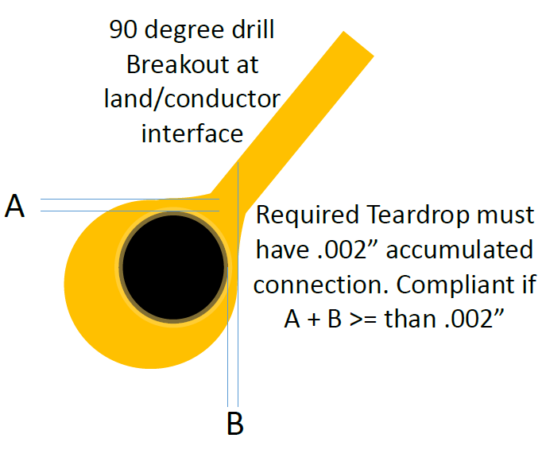 With increased densities many class 3 designs can’t achieve a minimum .000975” minimum annular but can’t accept 90 degree breakouts for high reliability. A useful comprise is the allowance of tangency as long as teardrops are added to the land/conductor interface.