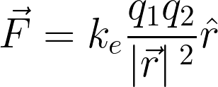 The magnitude of the force between any two point charges is proportional to the product of the particles’ electric charge q and inversely proportional to the square of the distance between the particles →r. Charge comes in multiples of 1.6 x 10-19 C and is carried on protons and electrons[3]. The direction of force lies along a straight line r that joins the two objects.