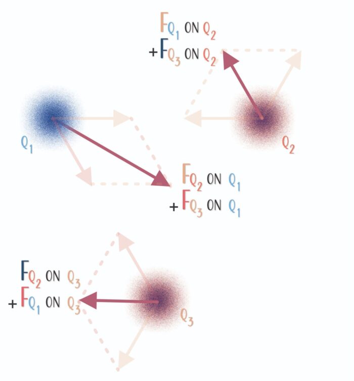 Determining the effects of multiple charges is relatively simple. The resulting force is the vector sum of all the individual forces on a given charge. ΣF = F1 + F2 + … + Fn. Superposition in this context simply means that each interaction’s contribution is independent of all other interactions’ contributions.