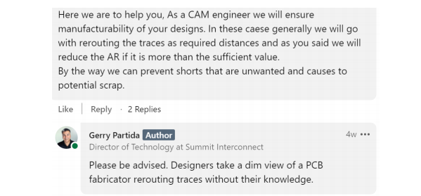 And now for the dirty little secrets that designers don’t know could happen. I will start by saying I DON’T EMPLOY THIS PRACTICE, but I know it exists. (I was a CAM Application Engineer, and visited over 100 PCB sites and trained many of them). There are fabricators that will simply reroute your conductors to increase spacing. I once saw a customer’s CAM operator making reroute edits and asked him “does the customer know you are modifying the routes,” and his answer was “the customer can’t see since the reroutes are hidden by the ground planes on layers 2 and X-1.” Don’t believe me? Here is a screen shot that a fabricator replied to a recent post of mine stating that he reroutes the conductors. Name has been removed to protect the guilty.