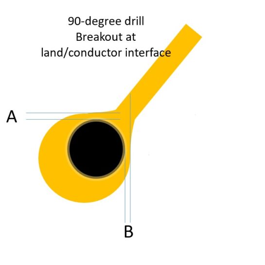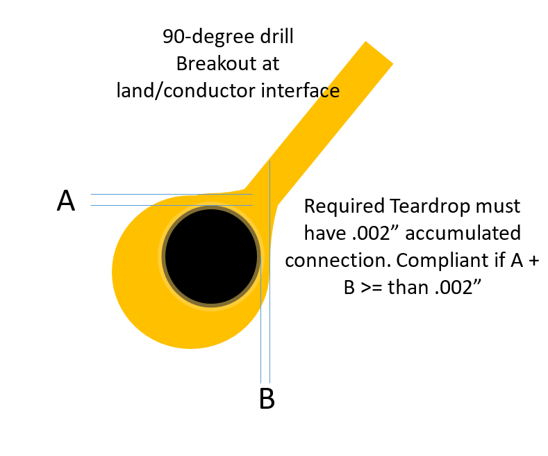 With increased densities, many class 3 designs cannot achieve a minimum .000975” minimum annular, but also cannot accept 90-degree breakouts for high reliability. A useful comprise is the allowance of tangency as long as teardrops are added to the land/conductor interface.