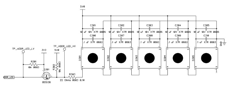 The Addressable RGB LEDs used in this circuit operate off of 5V power rail and 5V logic. While we could probably get away with running them from 3.3V logic, if there is too much ground bounce and Vcc-sag inside the LEDs, we could run into trouble. So a logic-level converter is created out of an N-channel MOSFET. The circuit has a bypass and bulk capacitor for each LED to help reduce noise with the assumption that the LEDS can be placed far from one another. The 0.1 uF capacitor should be placed as close to the LED as possible, with the 10 uF just on the other side of it.