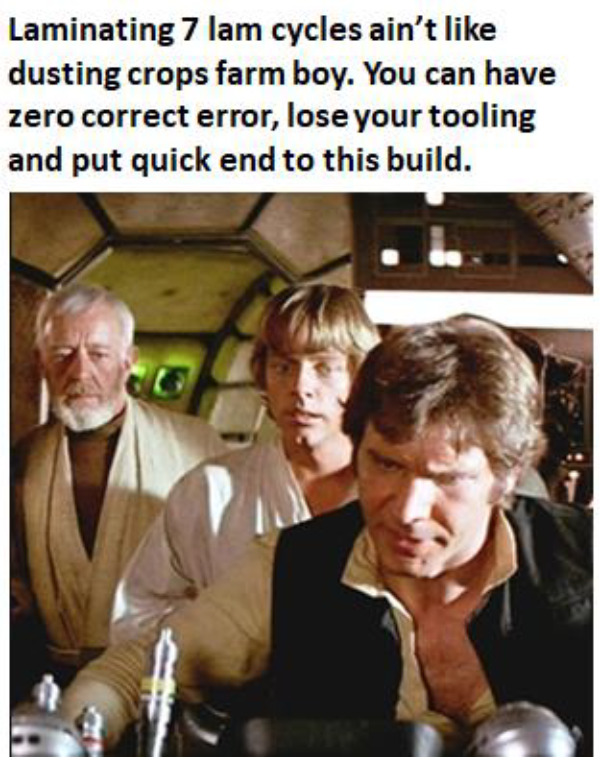 Well that’s it for now. I need to commence my bombing run on a high aspect ratio PCB with multiple lamination cycles, with a drill diameter that is too small, that wobbles, and an annular ring that should have been bigger, with no time to make a remake… “So let’s tighten up the formation, set your deflector shields to double front, and watch out for those Tie fighters. It will be just like Beggar’s Canyon back home”!